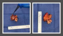 The pulmonary artery transection was completed and the pulmonary root was removed en bloc. Backtable inspection confirmed a 3.5 cm x 2.5 cm pedunculated mass with an anemone-like appearance and a stalk connected to the commissure of the anterior and left cusp.