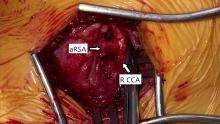The patient was then turned supine, a shoulder roll was placed, and the right arm was abducted 45 degrees. Through a supraclavicular incision between the heads of the sternocleidomastoid muscle, the pulseless aberrant right subclavian artery was found to be nearly mobilized in its entirety. This allowed for an expeditious aberrant right subclavian artery transposition onto the right common carotid artery in an end-to-side fashion. There was no change in near-infrared spectroscopy monitoring during carotid clamping, and a palpable right radial pulse was noted. A Jackson-Pratt drain was left in the supraclavicular exposure.