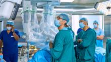 There was no adhesion, and the lung was well isolated. Two posterior and one anterior port were placed. The robot was docked to the patient. The inferior pulmonary ligament was taken down, and the level 9 lymph nodes were dissected and sent to pathology. The anterior and posterior pleura were opened, and the station 7 lymph node was dissected at this time.
