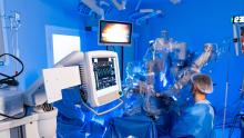 After induction of general anesthesia with a double-lumen endotracheal tube, the patient was positioned supine with a bump under the right scapula. The patient's chest, abdomen, groin, and upper thighs were prepped and draped.