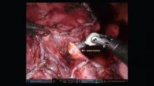 After port placement, we performed division of the inferior pulmonary ligament and harvest of the lymph node in station 9. After anterior retraction of the lung, we dissected the posterior mediastinal pleura and the pulmonary hilum posteriorly, and harvested station 7. Then we dissected the anterior hilum and the left superior pulmonary vein. After that, we reached the artery via the fissure, using a combination of monopolar and bipolar energy. We completed the anterior and posterior fissure using robotic staplers and then we sectioned the arterial branches of the left upper lobe and the left upper pulmonary vein with robotic staplers. We harvested station 11 and retracted the remaining pulmonary artery posteriorly using a Penrose drain to improve the exposure of the bronchus. The bronchus was cut using monopolar robotic scissors. A frozen section of the bronchial margin was performed and it was negative for malignancy.