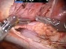 Once the vein is identified, the "L" hook is switched for the bipolar dissector then we will separate the thymus from the vein by tunneling anterior to the vein and underneath the thymus to facilitate identification of the left edge of the thymus. On the sternal side of the thymus, the dissection is carried across the mediastinum to expose the left internal mammary vessels. Often at this point we change to a 30 degree down scope and then, in succession, we dissect the right superior pole and the left superior pole. It is important to incise the investing fascia at this level and gently reduce each pole out of the neck. Using a hand over hand technique is helpful to gently deliver the superior poles. Defining the space between the poles is helpful (Video 2: Mobilization of the superior poles [5]). The far side of the left pole is identified by placing the bipolar dissector anterior to the vein through the tunnel previously created. In this fashion, the Cadière forcep can gently retract that edge to begin reducing the pole. Once the upper poles are dissected the individual draining branches are clipped or controlled with cautery as appropriate (Video 3: Management of thymic veins [6]).