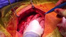 b) In this video, the authors used number 5 Ethibond interrupted sutures that passed through partial thickness of the bone to reduce and fix the sternal edges. They used this technique if the posterior surface of the sternum stuck with the front of the heart due to adhesions; in addition, he had five grafts.