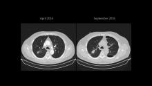 As the RUL was initially accessible for a wedge resection, the LLL nodule was approached first. A non-intubated SI-VATS S6 LLL anatomical segmentectomy was performed in April 2016. Four months later, a segmental S6 bronchopleural fistula was diagnosed and successfully managed with an endobronchial valve. A new chest scan then showed growth of the RUL lesion, requiring a posterior S2 segmentectomy instead of the initial wedge planned (Figure 1).
