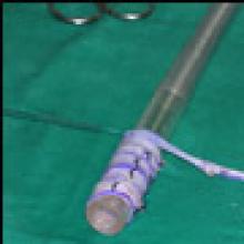 The patient was taken to the operating room where a standard median sternotomy was performed. Inspection revealed a left brachiocephalic vein that was completely obliterated and non-functioning. The SVC was normal at its junction with the right atrium, but at approximately mid level it was noted to be scarred and atretic to the level of the right internal jugular and right subclavian veins (Figures 2 and 3). Simultaneously the left saphenous vein, from inguinal canal to the ankle, was harvested endoscopically (Figure 4). Once harvested the vein was incised and opened longitudinally along its entire length. Using a standard 2-stage venous cannulae, a spiral vein graft was constructed using running 7-0 prolene suture, exchanging suture with each completed turn (Figures 5 and 6). The vein graft was left on the end of the cannulae and using a parachute technique an end-to-end anastomosis was first created in the distal SVC at the confluence of the right internal jugular and subclavian veins. The proximal anastomosis was constructed below the level of the obstruction at the entry area of the azygous vein. Following de-airing, inspection revealed the vein graft to be widely patent with no thrill or kinking (Figure 7). The patient was discharged home with coumadin with goal INR of 2.0 for 6 months. At six month follow-up, the patient reports significant improvement in her symptoms.