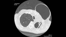 The patient is a sixty-seven-year-old man diagnosed with stage IIIA moderately differentiated squamous cell carcinoma of the left upper lobe. He completed neoadjuvant chemoradiation and underwent a left thoracotomy, left upper lobectomy, and mediastinal lymph node dissection. His course was complicated by necrotizing pneumonia and chronic empyema. He required prolonged drainage with an indwelling chest tube, decortication, and coverage of the left apical cavity with a pectoralis muscle flap. After removal of the chest tube, he developed a bronchocutaneous fistula and subsequent pneumothorax necessitans of the left anterior chest wall.