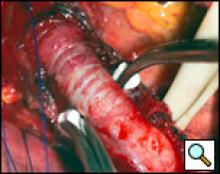 The surgical approach is a left posterolateral thoracotomy, entering the chest over the bed of the unresected 7th or 8th rib. On entering the thoracic cavity, the pulmonary ligament is divided and the lung is packed out of the way superiorly. The epiphrenic diverticulum is often found at the level of the inferior pulmonary vein. The pleura over the esophagus is divided allowing the esophagus to be gently mobilized. Penrose drains are used to encircle the esophagus superior and inferior to the diverticulum to facilitate the dissection (Figure 3). The diverticulum often arises to the right side necessitating rotation of the esophagus to clearly visualize the neck of the diverticulum. The diverticulum and its base are carefully dissected from the adjacent esophagus (Figure 4). Both vagus nerves are clearly identified and preserved during this maneuver. Once the diverticulum base is defined, a 40 Fr bougie is introduced across the gastroesophageal junction. This is performed under direct vision with the surgeon closely monitoring the safe passage of the bougie.