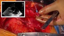 To arterially cannulate patients with acute aortic dissection, the authors use the modified Seldinger technique. They have found central cannulation to be practical and efficient and employ this technique in most of their patients. The inset picture is the transesophageal view of the wire in the true lumen which should be confirmed prior to dilating the track or inserting the aortic cannula. Venous drainage is through a dual stage right atrial cannula and an additional right angle curved venous cannula is placed in the superior vena cava for retrograde cerebral perfusion during the period of circulatory arrest. During circulatory arrest, the SVC cannula is clamped distal to the connection with the cardioplegia system and retrograde cerebral perfusion is utilized via the SVC cannula. They generally cool to four minutes after EEG silence or approximately 45 minutes of cooling. Retrograde cerebral perfusion is utilized for all hemiarch reconstructions and antegrade cerebral perfusion for all total arch reconstructions. The video demonstrates hypothermic circulatory arrest with retrograde cerebral perfusion. The distal ascending aorta is trimmed to the base of the innominate artery and the lesser curvature is resected An appropriately sized woven polyester graft is beveled, brought into the field and sewn to the aortic arch using running 4-0 prolene. It is important to note that no external felt or bioglue is utilized. When needed, a neomedia technique using Teflon felt is used where felt is sandwiched between the adventitia and the intima which are sewn to each other using running 4-0 prolene. The aortic graft is then recannulated. The aortic arch and the graft are deaired aggressively, the patient is placed back on cardiopulmonary bypass and rewarmed to normothermia. During the period of cooling and/or rewarming proximal aortic reconstruction is performed. When there is no tear in the sinus segment and the aortic root is not aneurysmal, the aortic valve is resuspended and the aortic valve and the aortic root complex is preserved. The authors perform the proximal anastomosis with 4-0 prolene without any felt reinforcement or the use of bioglue but utilize a felt neomedia technique where needed.