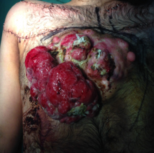 A 28-year-old man who worked as a laborer presented to the authors’ outpatient clinic with a large fungating mass on the anterior chest wall. The patient gave a history of growth during the prior 6 to 8 months. Because of financial concerns, he did not seek medical care earlier. He had no significant past medical history. On examination, he had a 17 x 16 x 7.5 cm mass (Figure 1).