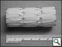 The next step is to prepare the Zenith iliac extender endograft for delivery through a longer sheath. The Zenith iliac limb extension is a self-expanding endograft constructed from 3 stainless-steel Z-stents sewn inside a 5.5 cm long tubular Dacron graft (Figure 2A). The limbs are supplied preloaded in 55 cm-long sheaths on either 16- or 18-F delivery catheters. The delivery catheter is constructed with a central metal hypotube that accommodates a 0.035-inch guidewire. The hypotube is imbedded in the delivery catheter plastic, with a gap in the catheter material near the distal end to accommodate the compressed endograft in the loaded, sheathed state (Figure 2B). The distal portion of the delivery catheter is a 10 cm long tapered tip (Figure 2C). This tip is permanently attached to the hypotube. The usual mechanism of deployment of the iliac limb is to withdraw the outer sheath while maintaining the inner delivery catheter in stable position. The endograft opens as each Z-stent is exposed by the sheath withdrawal, but is held in position by the delivery catheter until the final stent deploys. Once the endograft is completely opened, the delivery catheter can be withdrawn through endograft.