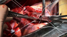 The repair begans with the placement of two 5/0 Prolene sutures at the annulus, anchored at the anterior/septal and anterior/posterior commissures. Additional Gore-Tex sutures were added based on the number of papillary muscles. The pericardium was then fashioned into a semicircular patch and sutured continuously to the annulus with 5/0 Prolene suture, extending between the previously placed anchors.