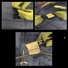 This video demonstrates the back table construction of the ECM TV cylinder valve. In the first frame, a piece of extracellular matrix was measured to the appropriate lengths for constructing the cylinder based on preoperative measurements. The width consisted of the TV annular diameter multiplied by pi. The length was the TV annular diameter multiplied by 1.3. In the second frame, the short edges of the previously cut-to-fit piece of extracellular matrix were secured with double-running layers of 5-0 prolene to form a cylinder. The third frame is a picture of the completed cylinder valve. Additional small extracellular matrix pledgets were also made from remaining matrix.