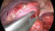 After making sure the arterial branches were “free of lymph node,” they completed the vascular dissection by applying a 35 mm white EndoStapler reload for each vessel. After arterial stapling, they saw the lymph node and the structures around it. For the inferior pulmonary vein, they also used a curved tip stapler reload to facilitate the passage of the stapler under the vessel.