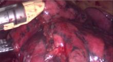 A 69-year-old patient was admitted to the authors’ department for a right lower lobe mass resection. The patient had a personal history of smoking (discontinued), hypertension, and COPD. He had no symptoms, but an x-ray revealed a mass in the right lower lobe, which was confirmed with a CT scan. The mass was a 44 x 40 x 38 mm, with a cystic appearance. Bronchoscopy showed extrinsic compression of the segmental bronchi 8 and 9. The FEV1 was 54% and the DLCO 123%. Considering that the mass had a benign appearance, the authors planned a VATS right basal segmentectomy, sparing the superior segment of the lobe.