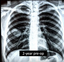 The patient was an otherwise healthy 26-year-old woman who presented with shortness of breath and chest pain. The patient was advised to quarantine based on suspicion of COVID-19. A week later, the patient presented to the emergency department with a pleural effusion and hemoptysis. She had an ultrasound of the pleural space and then a small-bore chest tube was inserted. The patient had CT and was diagnosed with a ruptured pulmonary hydatid cyst. The patient subsequently had two chest tubes inserted and three doses of intrapleural fibrinolytic therapy. She was then taken to the operating room for surgical management. Postoperatively, the patient had three chest tubes. The chest tubes were removed sequentially and she was discharged home on postoperative day 12. The patient had no intra-operative or postoperative complications.